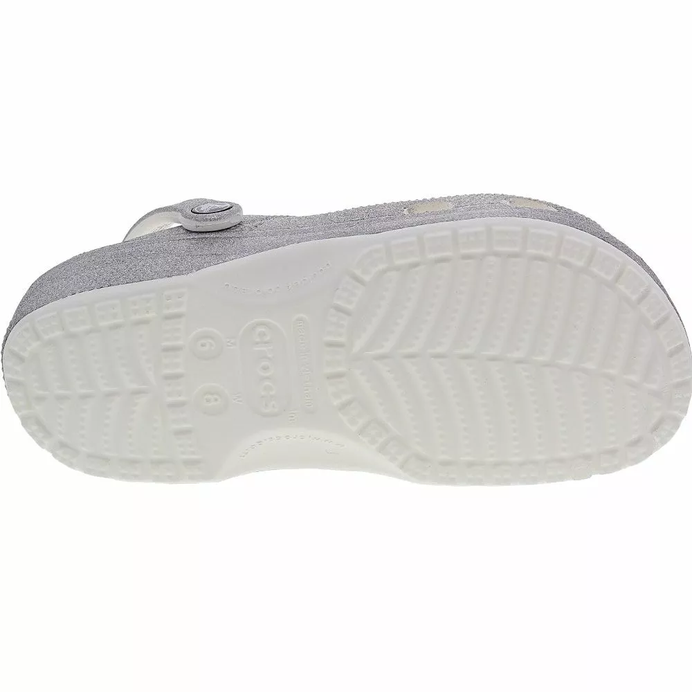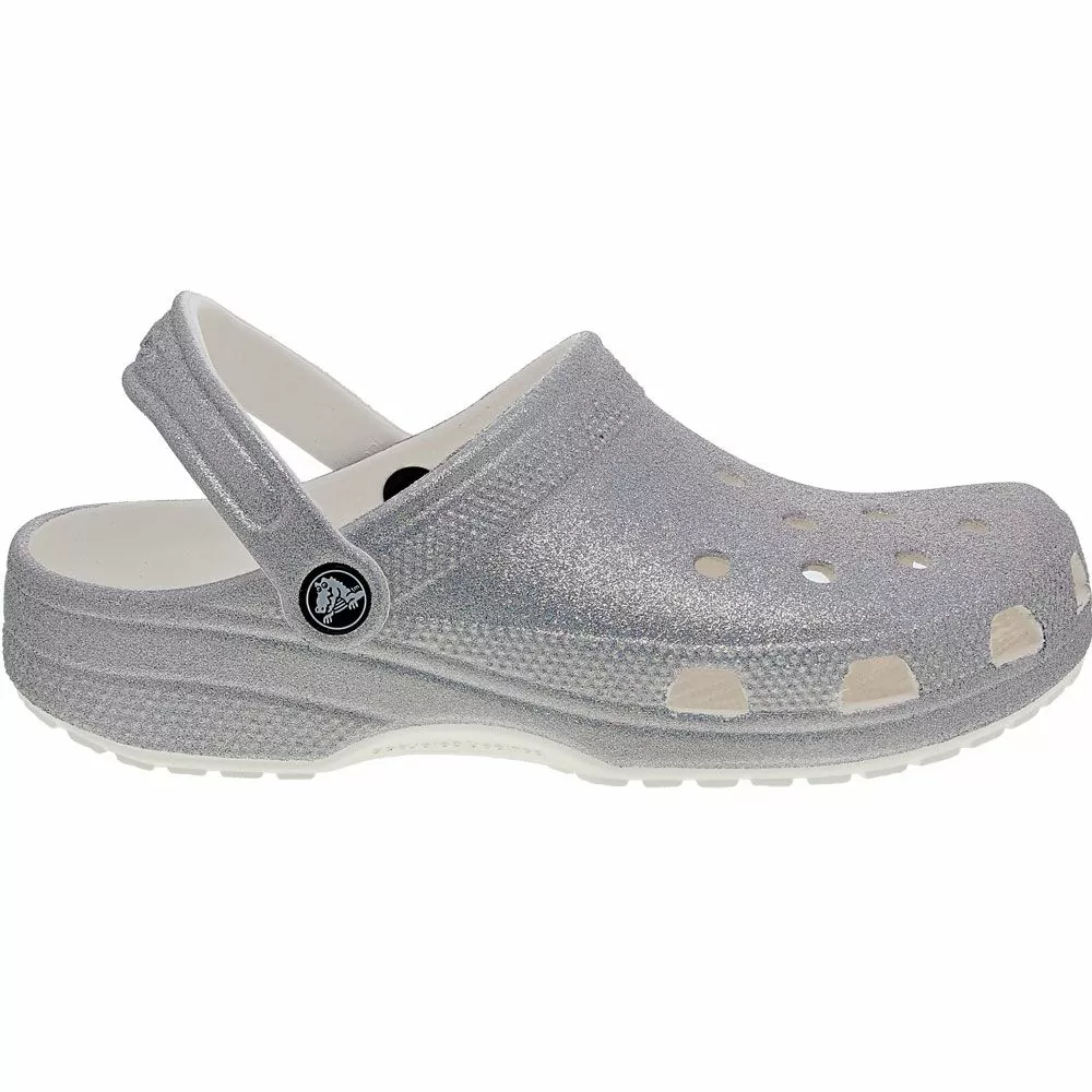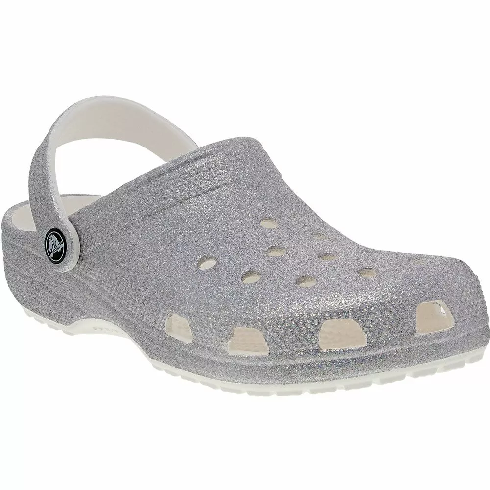 With bright glitter throughout, these unisex clog sandals are hard to lose. Classic-style glitter crocs featuring ventilation ports that let out water, pivoting heel straps and just a touch of support to help you stay on your feet. Designed to be the perfect thing to slip on for a casual trip through wet grass. Like all Crocs, they are remarkably lightweight and always easy to clean.