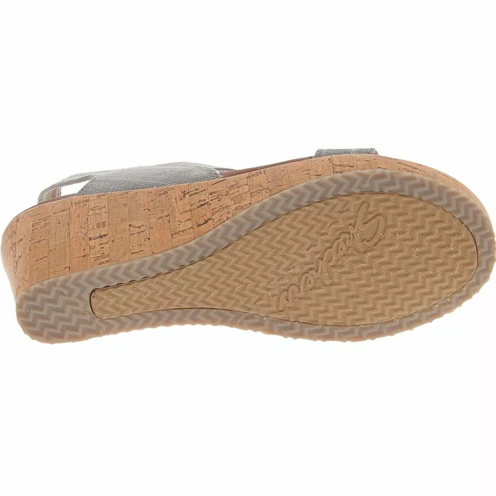 Skechers Beverlee Smitten Kitten Women’s Sandals. Whether strolling down the boardwalk or hitting the club, you will enjoy the comfort and versatility of these strappy, wedge women’s sandals. A touch of sparkle in the linen upper will complement your favorite pair of skinny jeans or that fun summer dress. The elastic slingback heel strap, grippy outsole and cushioned SKECHERS Luxe Foam footbed will keep you sure-footed and at ease for hours.