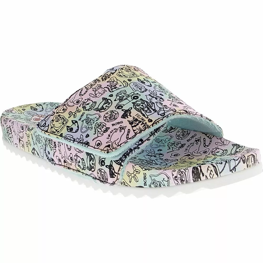Step out in comfort and show off your love for dogs everywhere with Pop Ups 2 Pastel Sun womens slide sandals from Skechers. Adorned with a fun print featuring an array of playful pups and kitties, these cushioned sandals celebrate the special five-year anniversary of BOBS. Easy care and easy comfort go hand in hand thanks to cushioned footbeds and upper straps fashioned from soft microfiber.