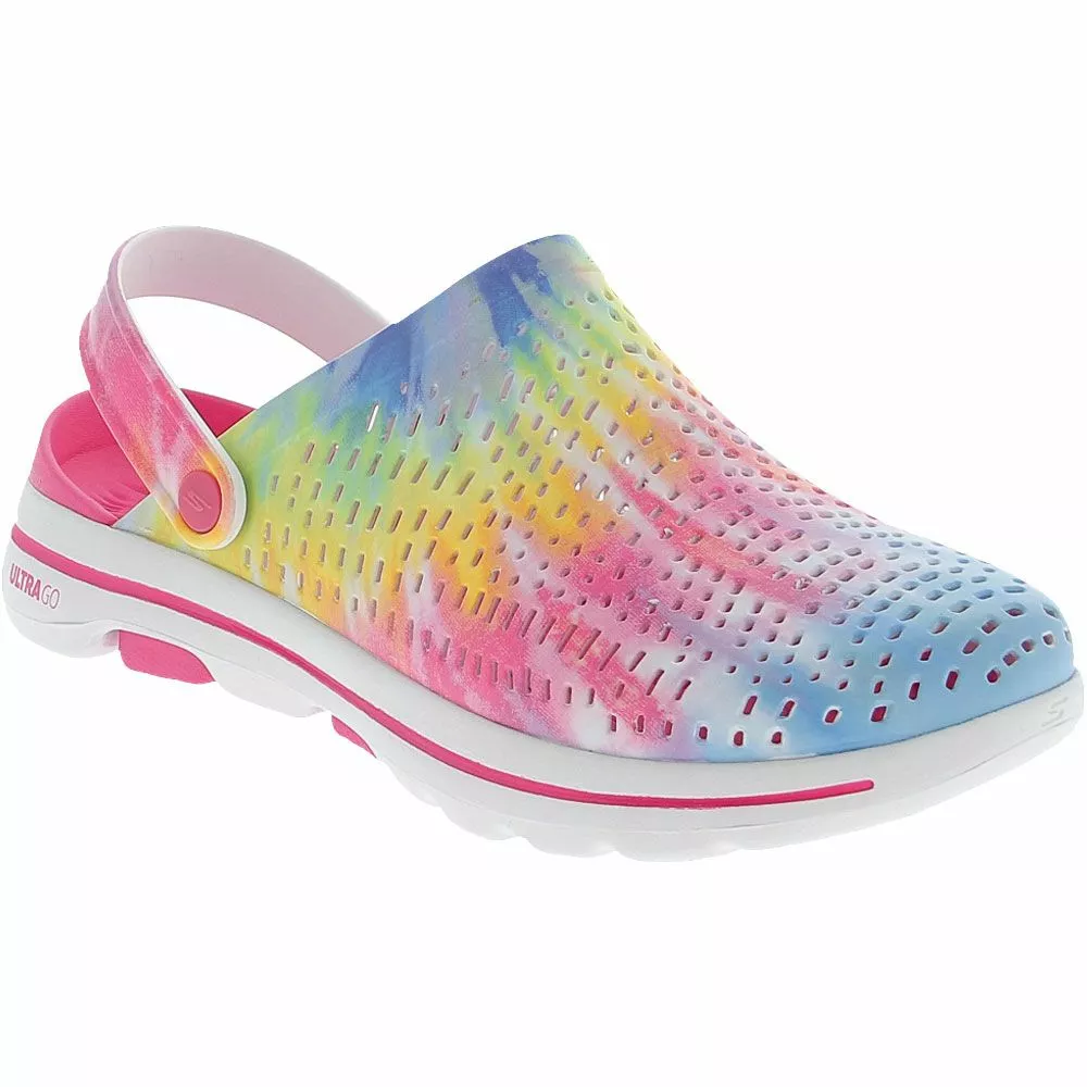 Skechers Foamies: Go Walk 5 Boogie Down Water Sandals – Women. These womens sandals are made for fun and comfort. The Skechers Cali Gear: GOwalk 5 – Boogie Down sandals are casual slip-on clogs that take you from quick errands around town to an afternoon backyard barbeque. Their colorful tie-dye print is the perfect playful complement to the spring season, and their lightweight cushioning and breathable design lets you enjoy the outdoors all day long.